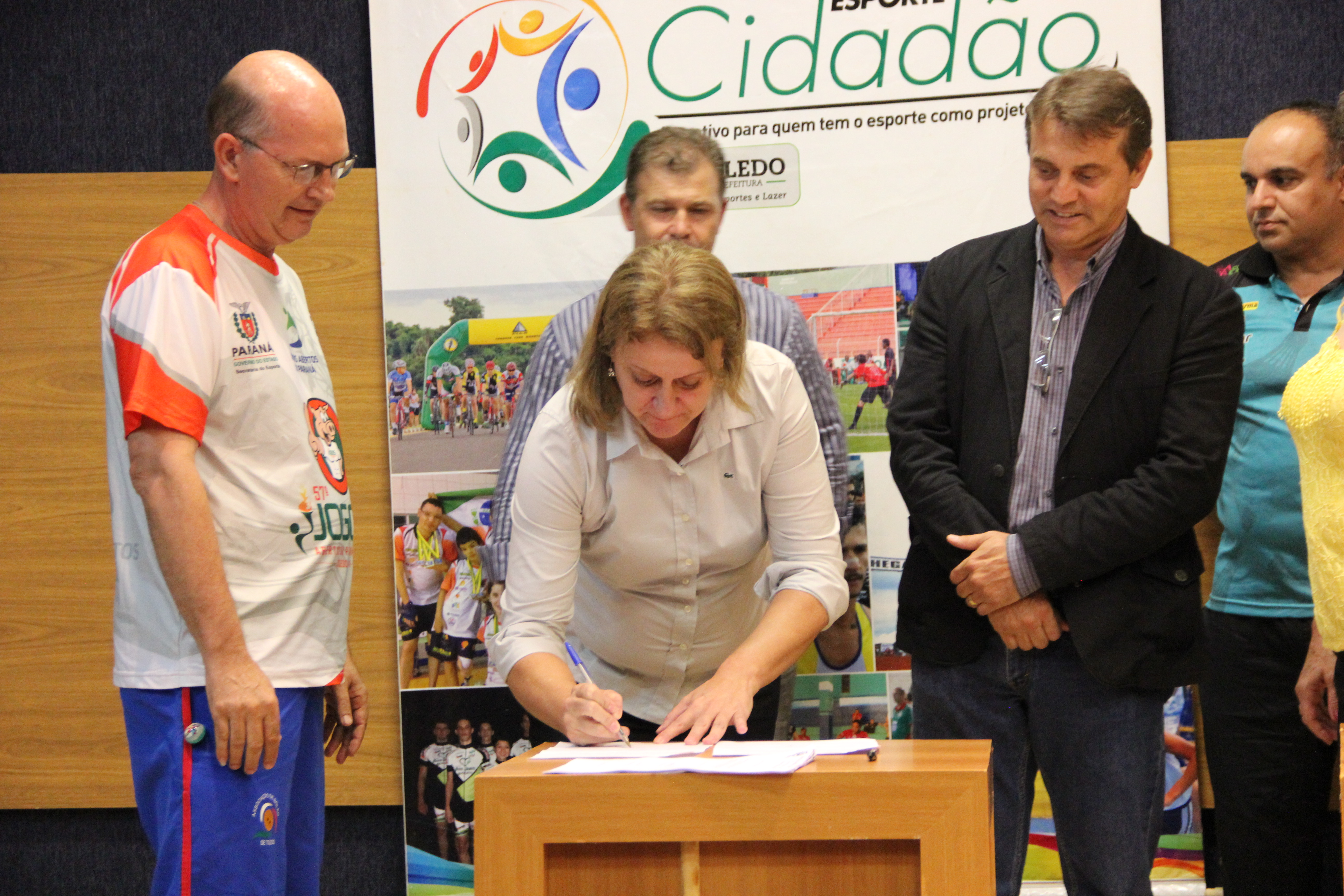 Diversos atletas e dirigentes prestigiaram, na quinta-feira (05), no Auditório Acary de Oliveira, a assinatura dos convênios do Programa Esporte Cidadão. O repasse beneficiará entidades por meio da destinação de valores para o desenvolvimento de ações desportivas ou o pagamento de arbitragem viabilizando competições comunitárias. Aproximadamente R$ 250 mil serão disponibilizados e o repasse de medalhas e troféus para premiação de atletas também está incluído neste montante.